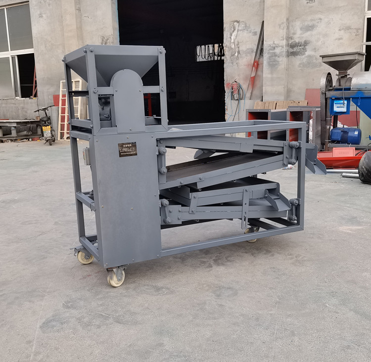 花椒篩分機(jī)主要是由電機(jī)、風(fēng)機(jī)、傳動(dòng)裝置、上下篩、機(jī)架等部件構(gòu)成,當(dāng)原枝花椒投進(jìn)料斗后--------粉碎裝置將原枝花椒進(jìn)行粉碎,將枝葉殼籽分別剝離下來--------通過下料器一起落到篩面上進(jìn)行分離篩分---------一層將篩出來的是大枝干、梅花椒、石子,復(fù)試篩網(wǎng)篩出來的是花椒枝--------二層篩出來的是花椒籽,椒籽出來的地方有風(fēng)機(jī),將里面輕的雜質(zhì)篩選出來-------三層是為篩分椒枝設(shè)計(jì),整層篩出來都是花椒枝------底層篩出來的是花椒殼,復(fù)試篩網(wǎng)是塵土雜質(zhì)等。